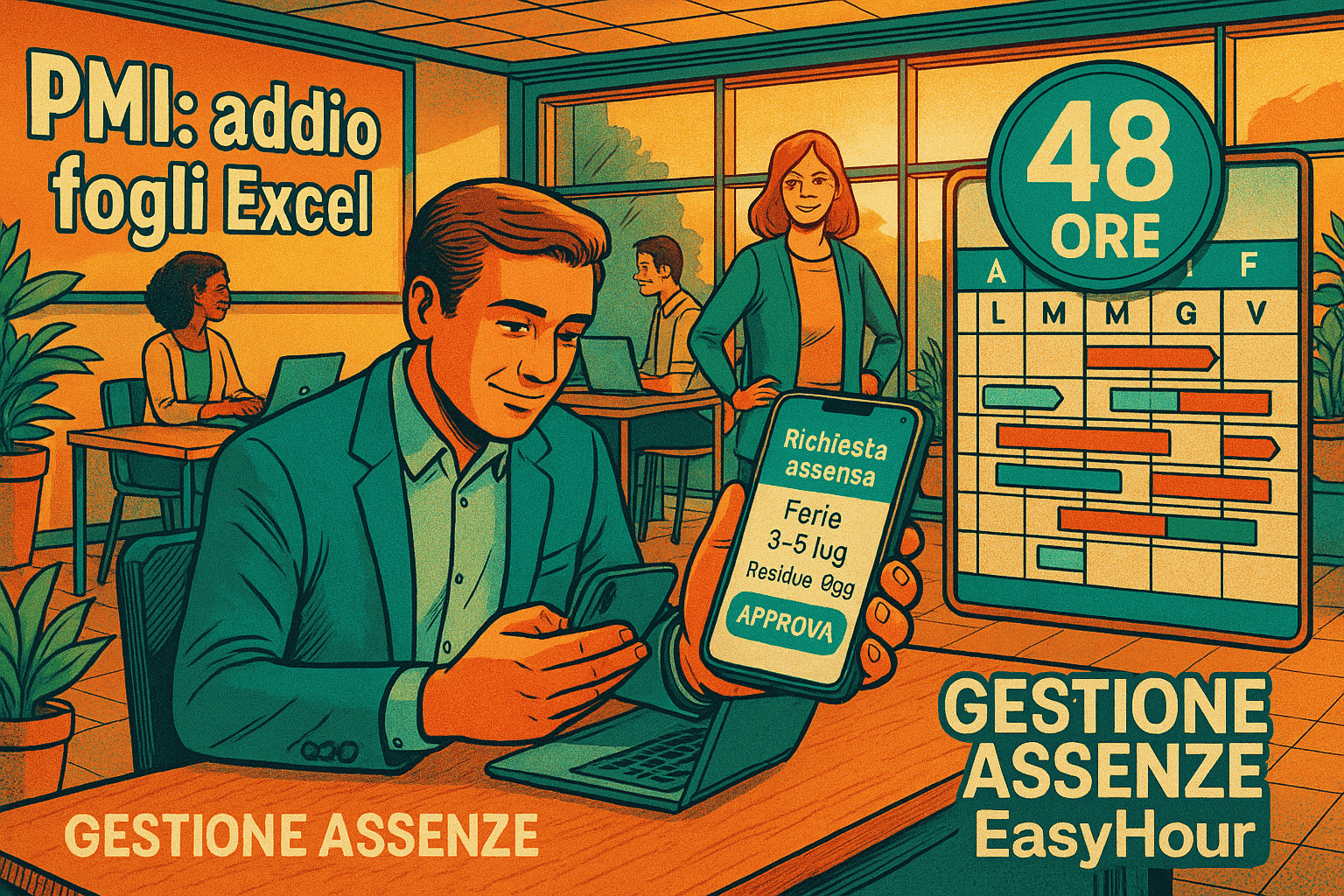 Nelle PMI la gestione dei giustificativi (ferie, permessi, malattia, formazione) spesso vive tra email, chat e fogli Excel. Risultato: ritardi, errori e mancanza di visibilità. Con Gestione assenze di EasyHour attivi un flusso snello, chiaro e tracciato.