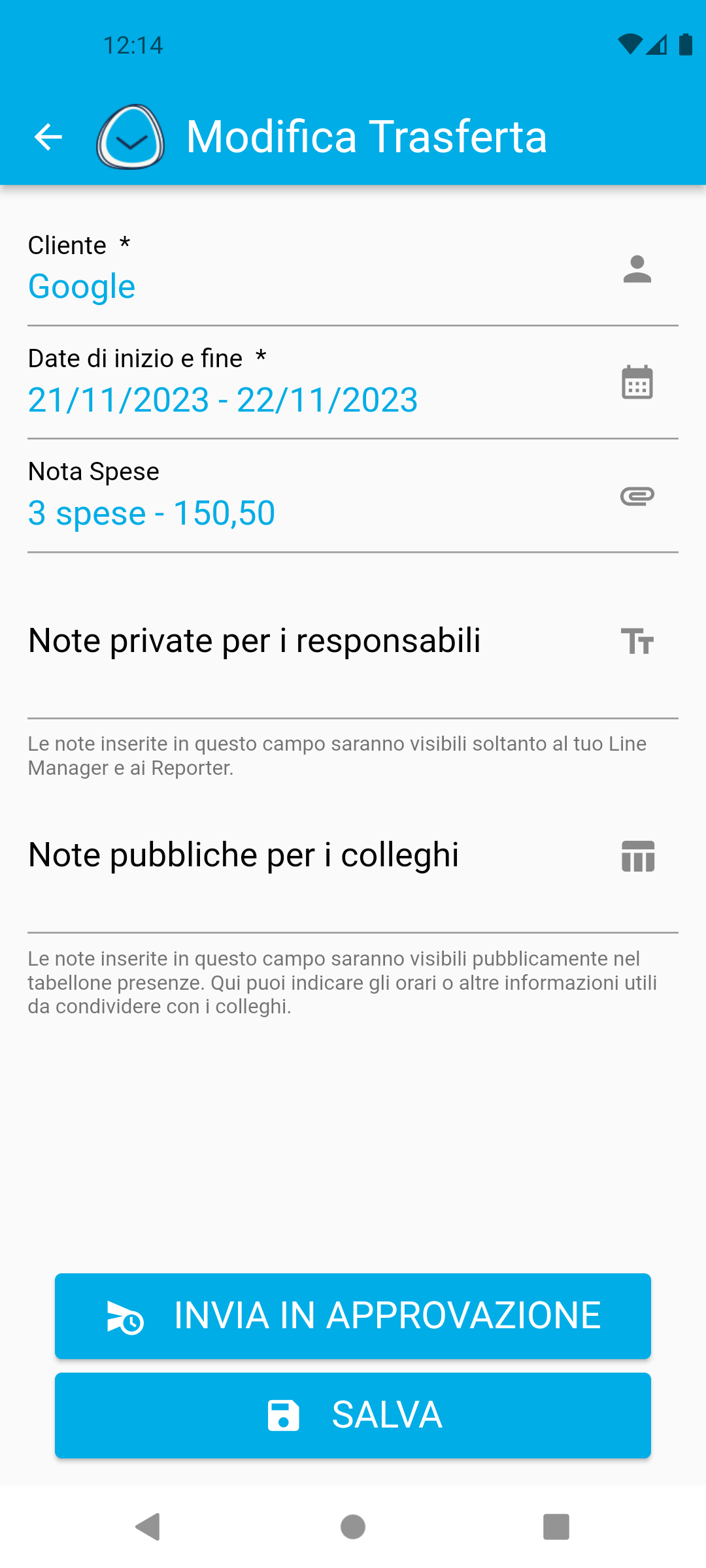 - In attesa di approvazione: cliccando il pulsante Invia in approvazione all'interno di ogni trasferta questa andrà in attesa di approvazione. Le trasferte in questo stato compaiono nel tabellone presenze, nei report (selezionando il filtro Stato > In attesa di approvazione) e nella sezione Azienda > Richieste.